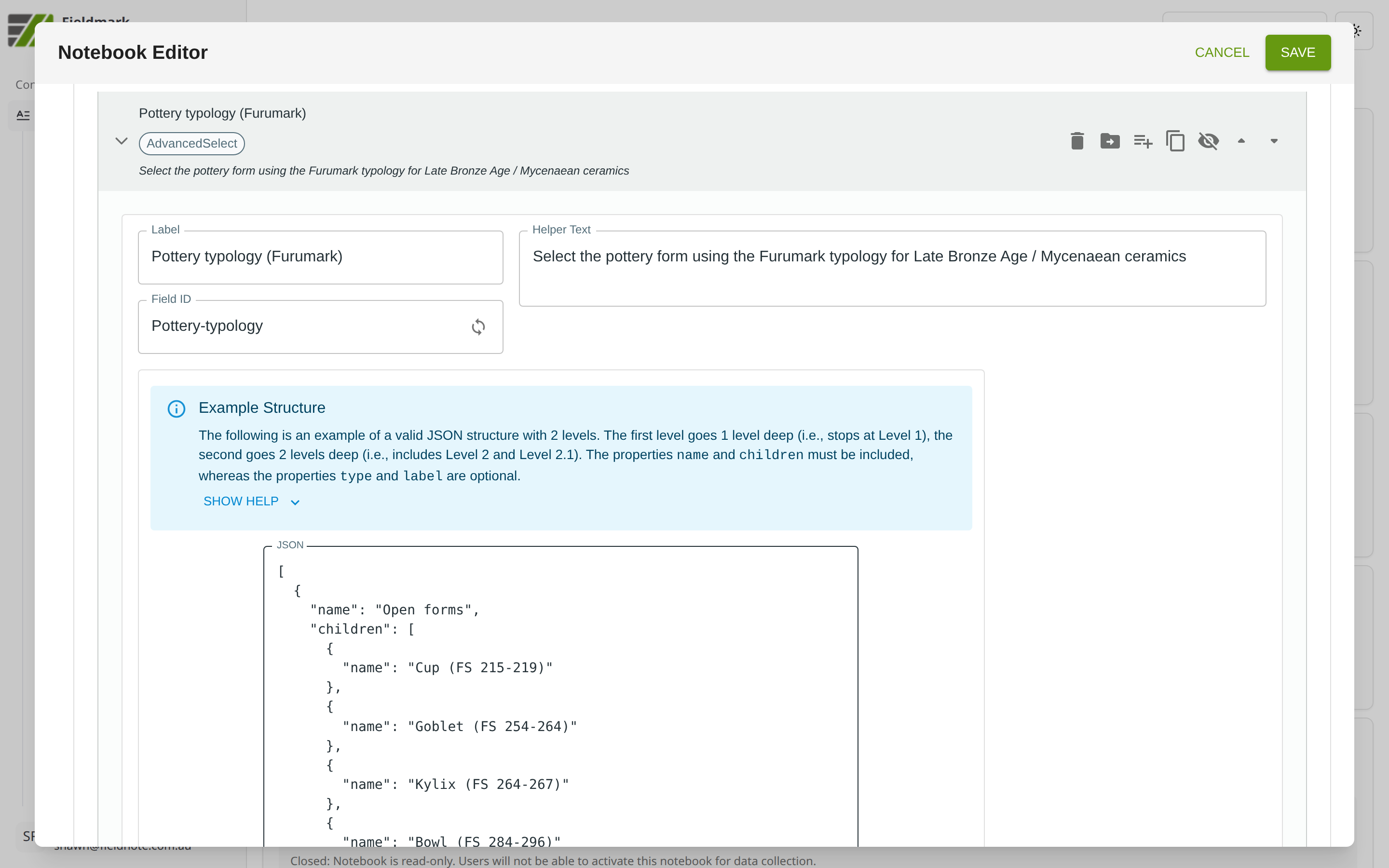 The Notebook Editor exposes only basic field properties for this field type. The hierarchy structure itself must be defined by editing the notebook JSON directly. A JSON editor is provided in the Editor UI, pre-populated with a simple template. Expanding the blue “Example Structure” info box displays an example of a valid JSON structure with two levels.