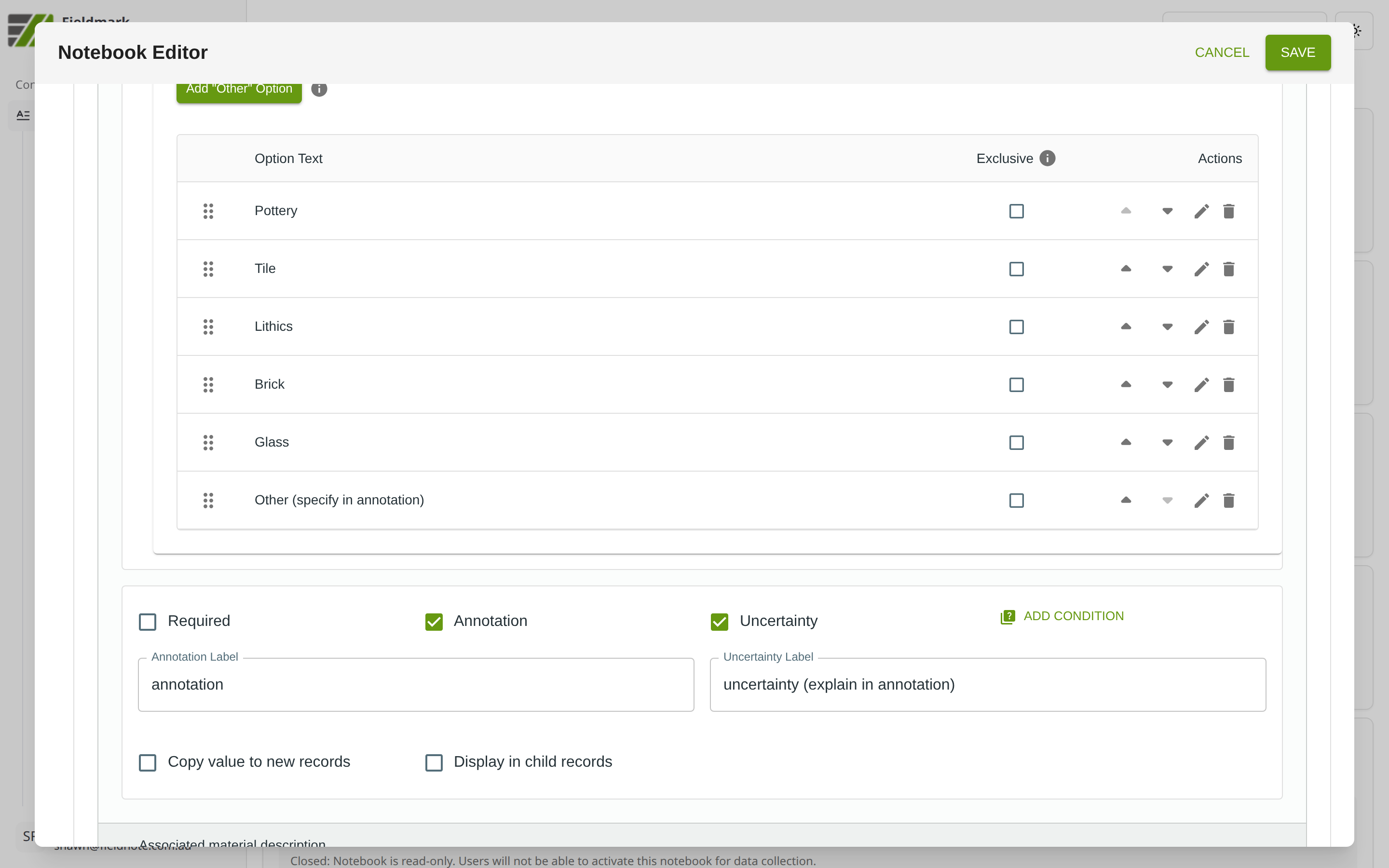 Configure exclusive options when certain choices invalidate others. For example, selecting “None observed” should clear all other selections. Tick the Exclusive checkbox on that option’s row.